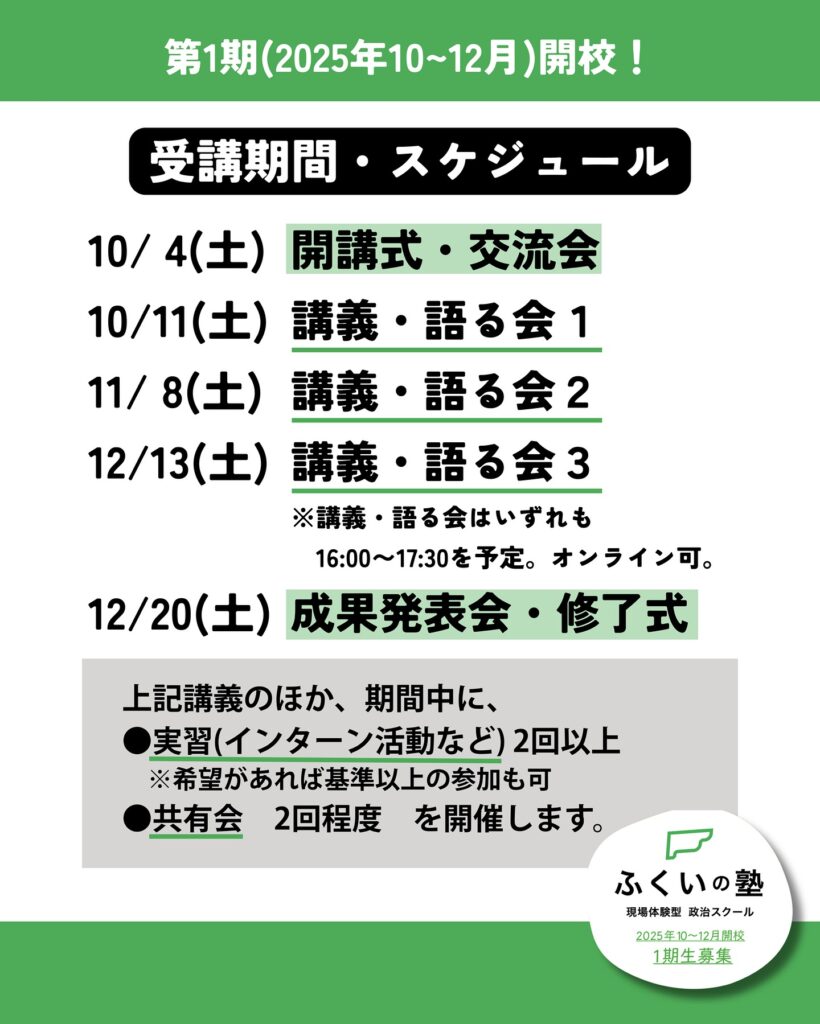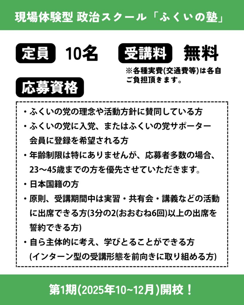 その他詳細や申し込みは「ふくいの党」ホームページ内の「ふくいの塾」ページをご覧ください。