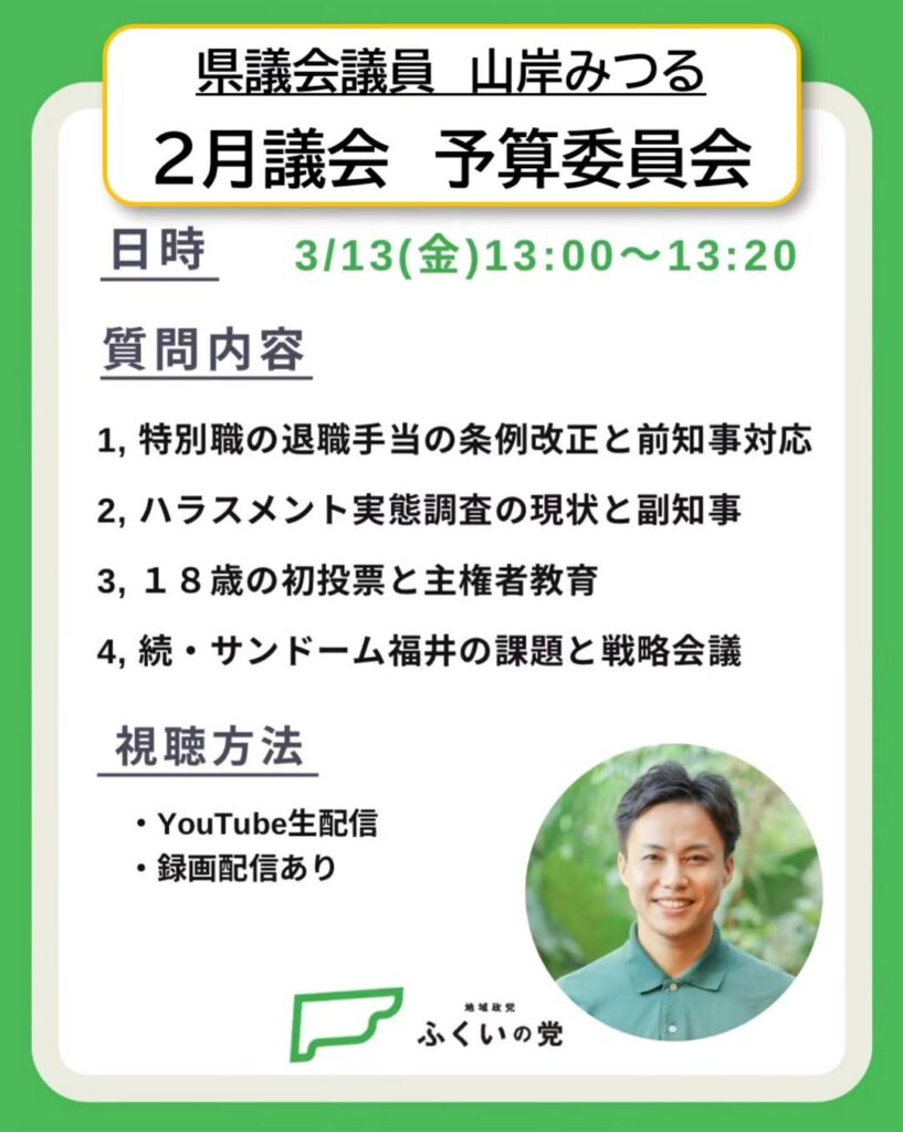 🟢26年2月県議会・予算決算特別委員会の予定(3/13)🟢